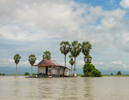 Après cette navigation inattendue, vous atteignez le village construit sur pilotis. Votre canot passe entre les habitations, explorant de l’intérieur ce village hors du monde. Vous découvrez ainsi un autre rapport au temps et un autre rythme de vie. Vous passez une nuit inoubliable à l’intérieur de l’une de ces maisons flottantes.