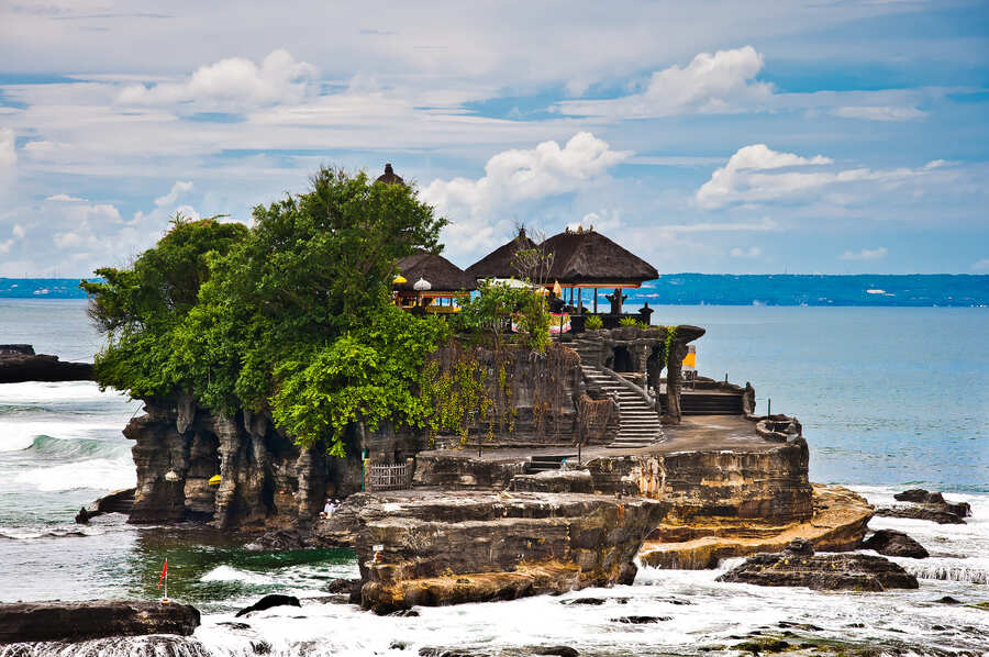 Tanah Lot, un temple hindou accessible uniquement à marée basse par une bande de terre. C'est un lieu spirituel important pour les Balinais et offre un magnifique décor au coucher du soleil.